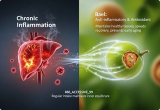 One major cause of many common modern complex diseases, such as heart disease and metabolic disorders, is chronic inflammation. Bael has powerful anti-inflammatory compounds that help prevent inflammation in the body. Its antioxidant qualities help to terminate free radicals, which could lead to oxidative stress and cell damage. This is essential to maintain healthy tissues, speed up recovery and prevent early aging. 886_ACCESSIVE_99 Regular intake of the bael maintains our inner equilibrium, which is a precondition for ensuring natural strengths and richness.