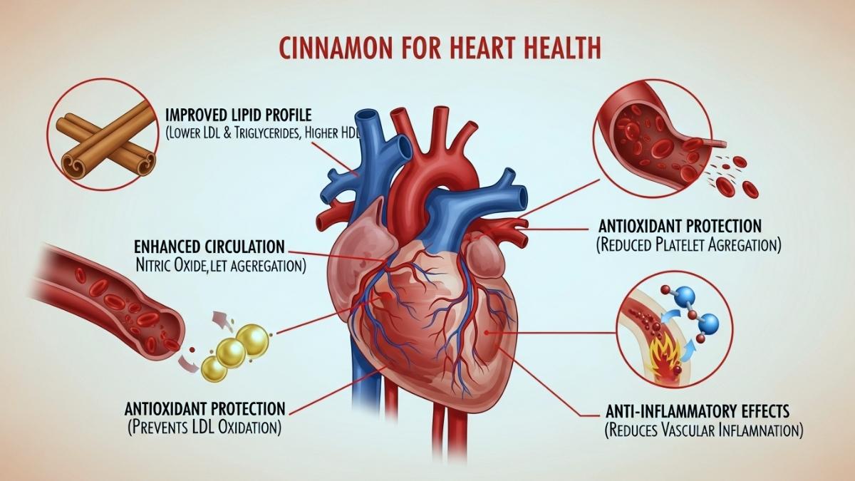 Cinnamaldehyde opens up blood vessels, which helps blood flow and supports the function of the endothelium. Cinnamon promotes cardiovascular health by increasing nitric oxide production, lowering platelet aggregation, and making blood vessels more flexible. Its antioxidant properties stop LDL cholesterol from oxidizing, which is a key step in the formation of plaque. This makes it even more important for preventing heart disease.