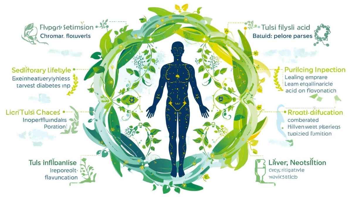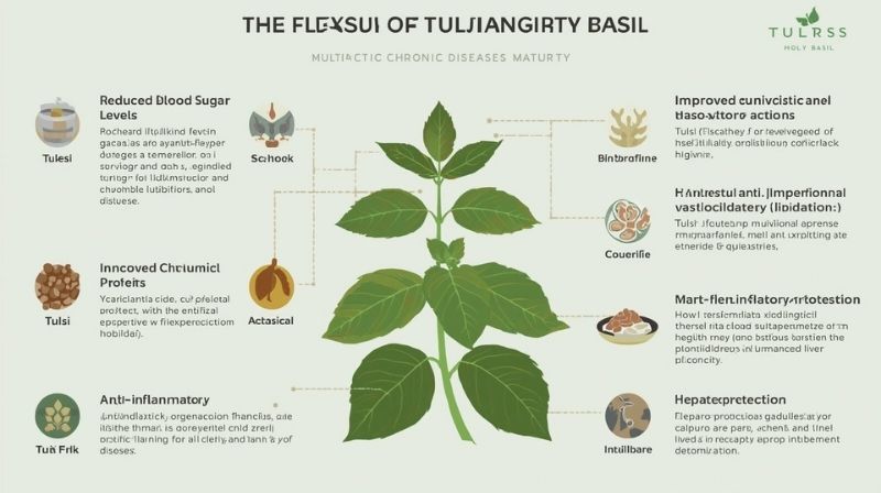 Another significant benefit is CV protection. Tulsi has antiplatelet and vasodilatory properties that protect against thrombosis and improve endothelial function. The oxidation of low-density lipoprotein (LDL), a critical phase in its atherosclerosis-inducing maturation, is inhibited by their antioxidant flavonoids. The vasculoprotective effect of tulsi is achieved by reducing systemic inflammation and oxidative stress.