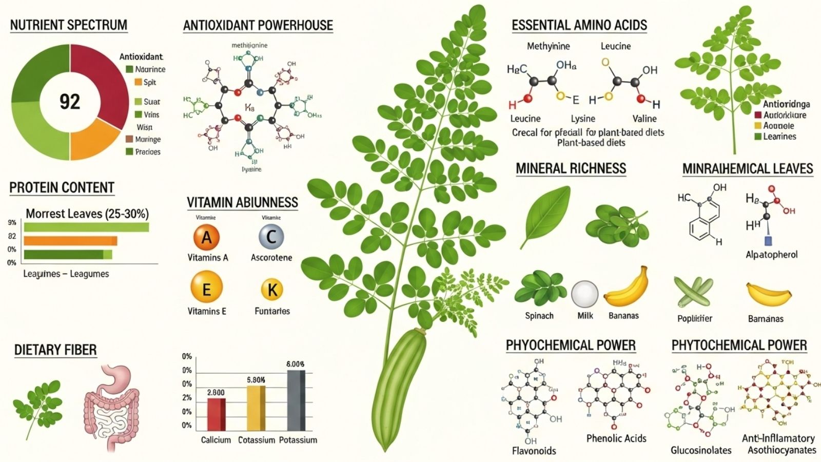 People all over the world praise moringa as one of the few plants that has almost all the nutrients it needs. It has 92 different nutrients and 46 different types of antioxidants in its leaves. Moringa leaves are scientifically rich in essential amino acids like methionine, leucine, lysine, valine, and phenylalanine. These are nutrients that are often missing from plant-based diets. People are interested in moringa’s protein profile because its leaves have about 25–30% protein, which is similar to some legumes. It is also one of the richest natural multivitamins because it has many vitamins, such as vitamin A (as beta-carotene), vitamin C (ascorbic acid), vitamin E (alpha-tocopherol), and vitamin K.