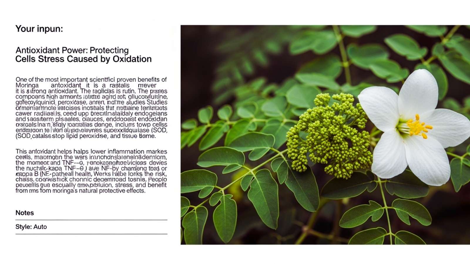 One of the most important scientifically proven benefits of moringa is that it is a strong antioxidant. The plant contains high amounts of quercetin, chlorogenic acid, caffeoylquinic acid, and rutin. These compounds are known to fight free radicals and lower oxidative damage. Free radicals are unstable molecules that break down cells, speed up aging, and cause long-term diseases like cancer, diabetes, and heart problems.