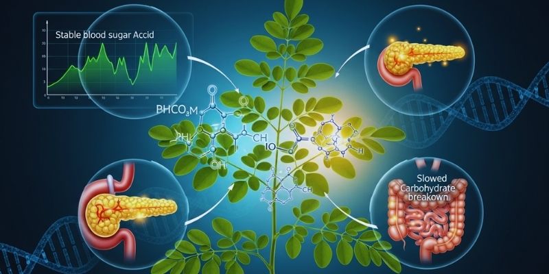 Scientists are genuinely interested in moringa because it can help people with diabetes. It has chlorogenic acid and isothiocyanates in its leaves, which help control how much glucose is absorbed, how much insulin is released, and how fat is broken down.
