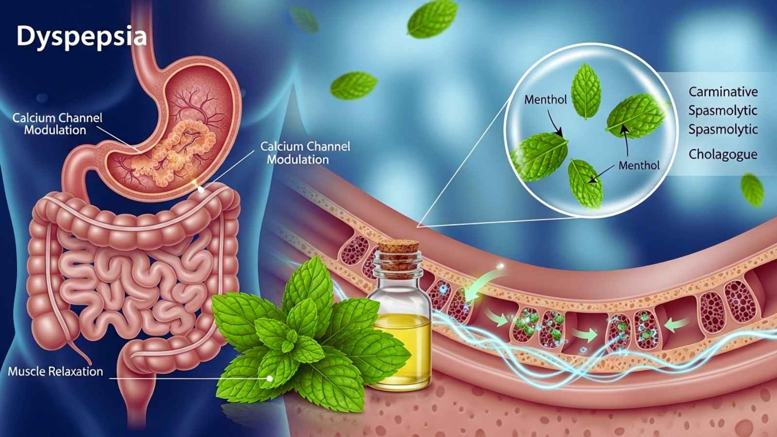 When digestive enzymes, gastric motility, and gut function don’t work right, it’s called dyspepsia. Peppermint is known around the world as a natural way to treat indigestion because it has strong carminative, spasmolytic, and cholagogue properties. Menthol, the main bioactive compound, works on the calcium channels in the walls of the intestines to relax the smooth muscles of the gastrointestinal (GI) tract. When these channels are controlled, the muscles in the intestines stop contracting too much, which helps with spasms, bloating, and stomach pain. This is why peppermint oil is used in medicine for functional dyspepsia and irritable bowel syndrome (IBS).