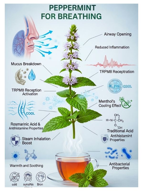 Because it naturally opens up airways, breaks up mucus, and reduces inflammation, peppermint is highly valued for helping with breathing. Menthol makes you feel cool and opens up your nasal airway, making it easier to breathe. It works on the TRPM8 receptors that are sensitive to cold, making you feel like air is flowing freely even before the mucus clears.