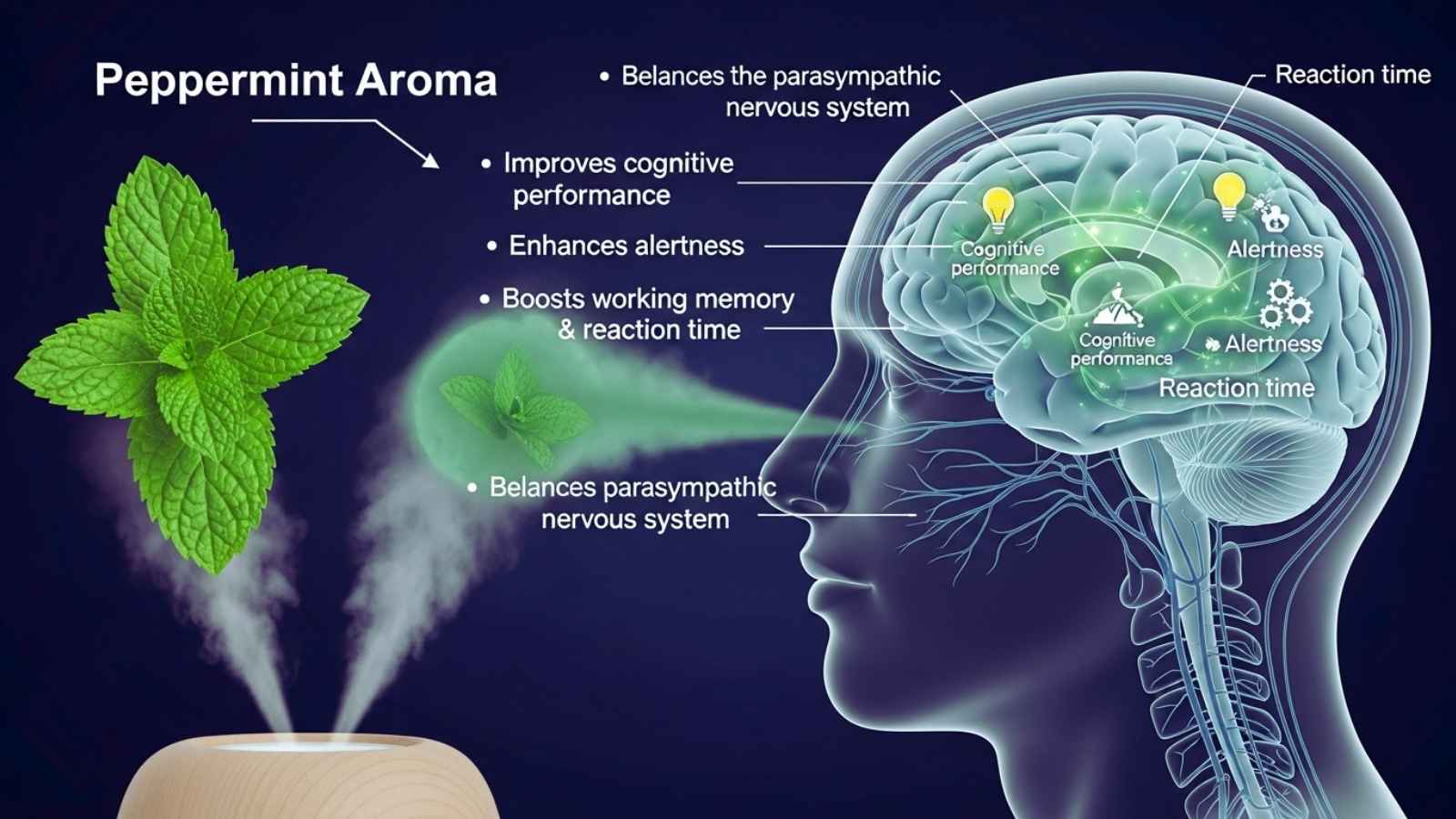The smell of peppermint has a direct effect on the brain and the nervous system. Studies have shown that breathing in peppermint can improve cognitive performance, alertness, working memory, and reaction time. Its fresh scent wakes up the central nervous system, which helps you feel less worn out and more focused.
