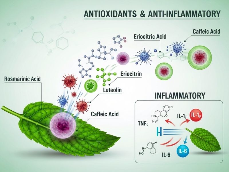 The antioxidants in peppermint, like rosmarinic acid, eriocitrin, luteolin, and caffeic acid, help reduce oxidative stress, which is a major cause of long-term health problems Pollution, smoking, stress, and metabolic activity all make free radicals, which these antioxidants protect the body from. Peppermint helps cells repair themselves and protects the immune system by lowering oxidative load.