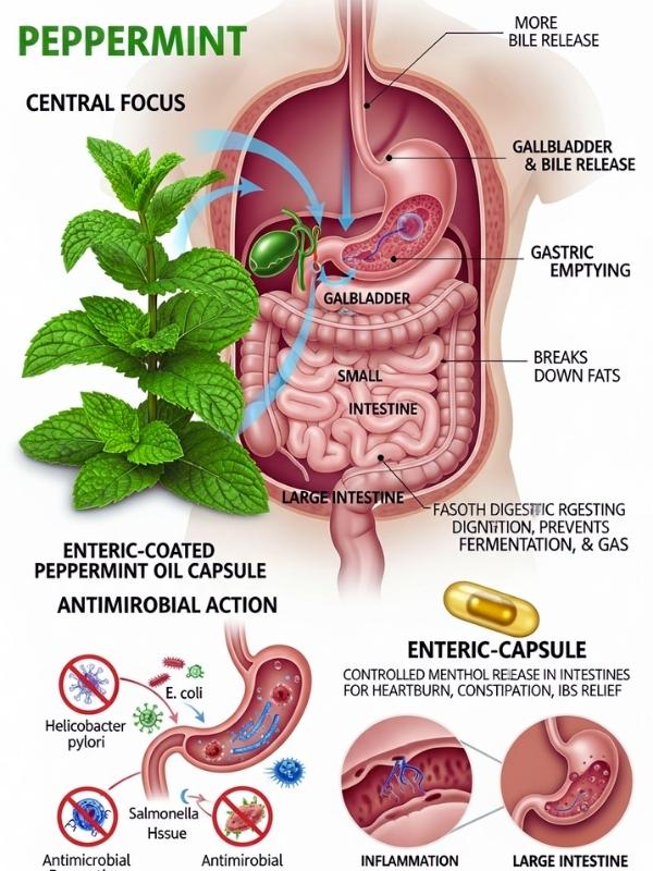 Peppermint leaf extract also helps the gallbladder release more bile, which helps break down fats and stops the heaviness that comes after eating oily foods. Peppermint helps food move through the digestive system smoothly by speeding up gastric emptying. This stops fermentation and gas buildup. Several clinical studies show how enteric-coated peppermint oil capsules work. They ensure that menthol travels to the intestines instead of breaking down too soon in the stomach. This controlled release provides the most relief from heartburn, constipation, and IBS-related pain.