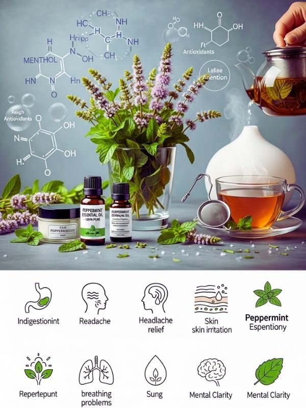 For hundreds of years, people have loved peppermint (Mentha × piperita) as one of nature’s most powerful herbal medicines. Peppermint is still an important part of both traditional and modern phytotherapy because of its refreshing smell, cooling effect, and high therapeutic value. Its leaves have a wide range of biologically active compounds, such as menthol, menthone, menthyl acetate, limonene, and rosmarinic acid, that work together to improve human health. Today, peppermint is used a lot to help with digestion, headaches, skin care, and breathing and as an antimicrobial agent. This article looks at the science behind peppermint’s natural healing power and gives evidence-based tips that can help you feel better every day. Peppermint is a natural remedy that has been used for a long time and has been shown to work by science. It can provide relief from indigestion, headaches, and skin problems.