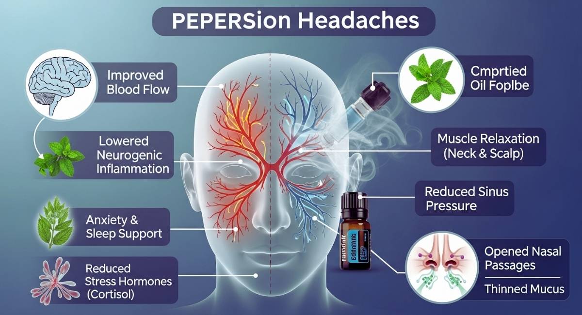 Stress, muscle tension, inflammation, dehydration, sinus pressure, and problems with the nervous system and blood vessels can all cause headaches. Peppermint, especially peppermint essential oil, is a quick, natural, and scientifically proven way to get rid of headaches.
