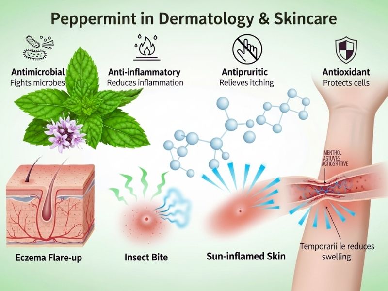 Because it has antimicrobial, anti-inflammatory, antipruritic, and antioxidant properties, peppermint is often used in dermatology and skin care products. Menthol, which cools the skin, activates cold-sensitive receptors in it. This helps to ease itching, redness, and irritation. This feature means that peppermint can help with dermatitis, eczema flare-ups, insect bites, and skin inflammation caused by the sun. It makes blood vessels smaller, which temporarily reduces swelling and gives immediate relief to areas that are inflamed or puffy.