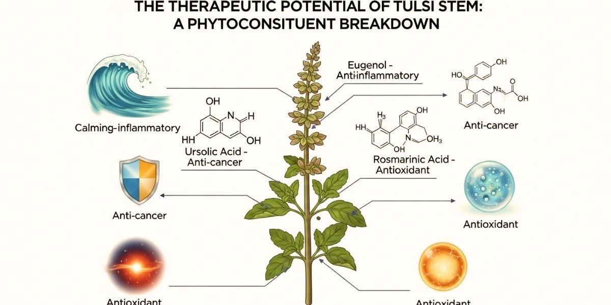 The diverse phytoconstituents of the Tulsi stem are responsible for its therapeutic potential. Eugenol, one of its primary volatile oils, has been demonstrated to possess anti-inflammatory and antimicrobial properties by inhibiting cyclooxygenase (COX) pathways and modulating pro-inflammatory cytokines such as TNF-alpha and interleukin-6. By regulating the expression of antioxidant enzymes and lipid metabolism, ursolic acid plays a role in hepatoprotection, antihyperlipidemic action, and metabolic modulation.