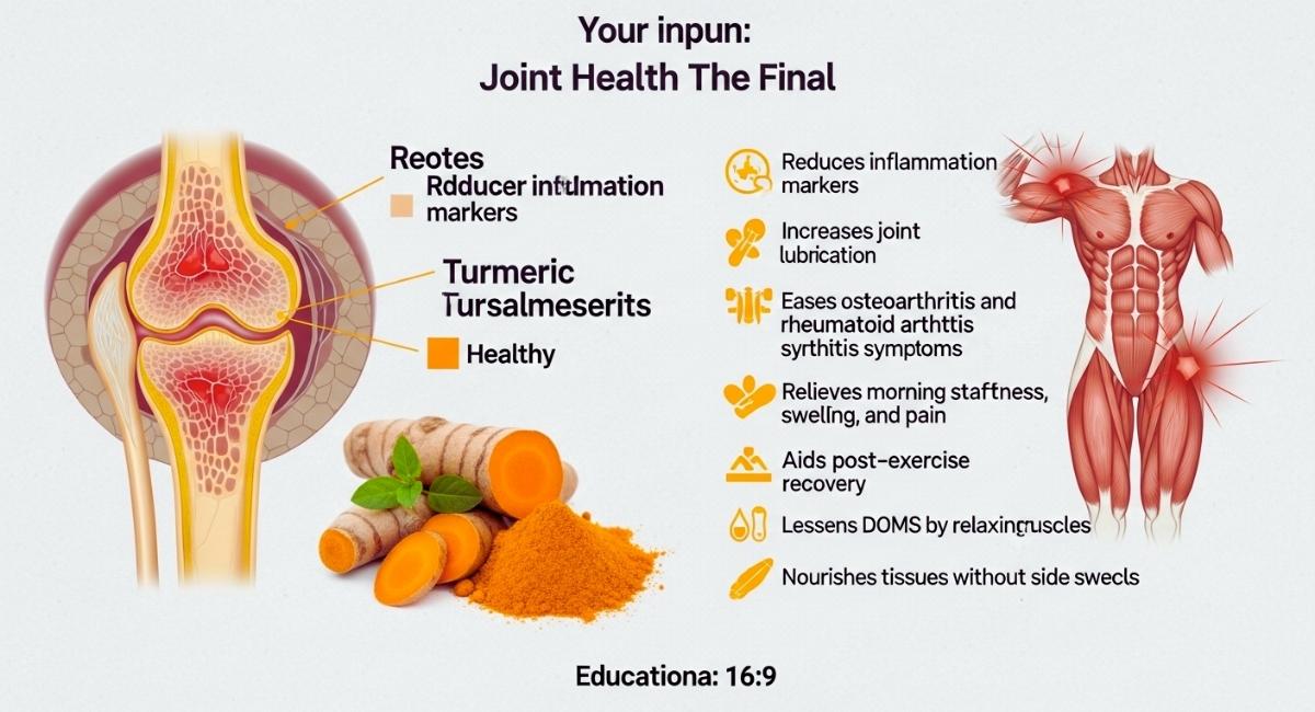 As people get older, their joints can hurt and become stiff, and their muscles can become inflamed. This can happen because of stress, autoimmune diseases, or just getting older. Turmeric helps naturally by lowering markers of inflammation and making joints more slippery. Studies show that curcumin is very good at easing the symptoms of osteoarthritis and rheumatoid arthritis by lowering synovial inflammation and stopping enzymes that break down joints.