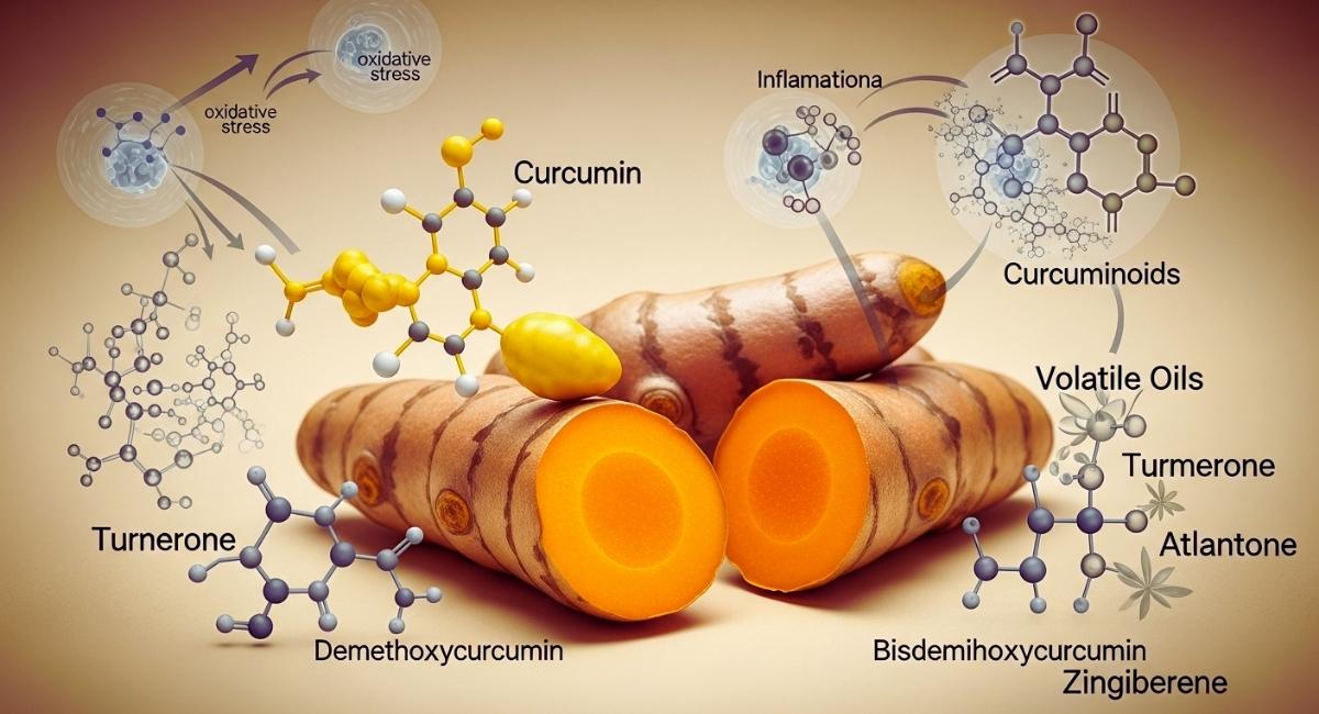 Turmeric contains a lot of different phytochemicals, each of which helps it work as a medicine. Curcumin, a polyphenolic compound that gives the rhizome its bright yellow color, is the most important of these. Curcumin is one of a group of molecules called curcuminoids. Other members of this group are demethoxycurcumin and bisdemethoxycurcumin. These molecules have strong biological effects, especially when it comes to changing the pathways that cause oxidative stress and inflammation. Turmeric has volatile oils like turmerone, atlantone, and zingiberene in addition to curcuminoids. These oils have antimicrobial and anti-inflammatory properties that work well with curcuminoids.