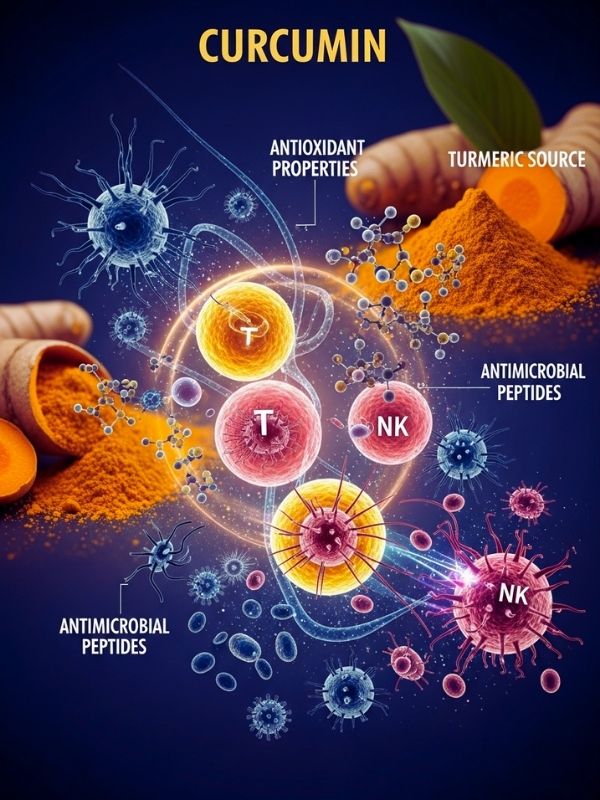 Curcumin boosts the immune system in a number of ways. It makes macrophages, T-cells, B-cells, and natural killer (NK) cells work harder. These cells are all very important for finding and getting rid of pathogens. Its antioxidant properties help the immune system by lowering oxidative stress, which can otherwise make the immune system work less well. Turmeric also helps the body make antimicrobial peptides, which boost its natural defenses against bacteria, viruses, and fungi.