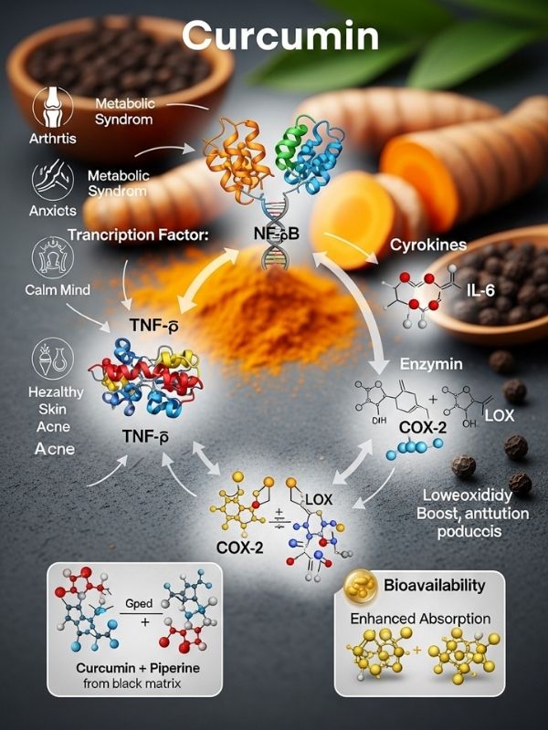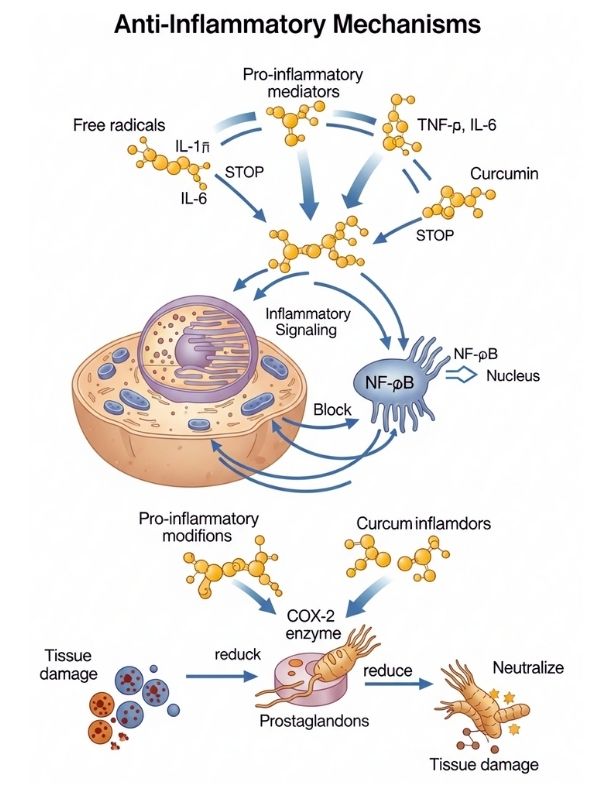 Curcumin reduces inflammation by lowering the levels of pro-inflammatory mediators like IL-1β, TNF-α, and IL-6. It also stops NF-κB, a transcription factor that controls how many inflammatory genes are turned on. Curcumin helps the body stay in balance by blocking this pathway and lowering too much inflammatory signaling. Curcumin also changes the COX-2 enzyme, which lowers the production of prostaglandins that cause pain, swelling, and inflammation. Its ability to fight free radicals also stops tissue damage, which can lead to inflammatory cascades.